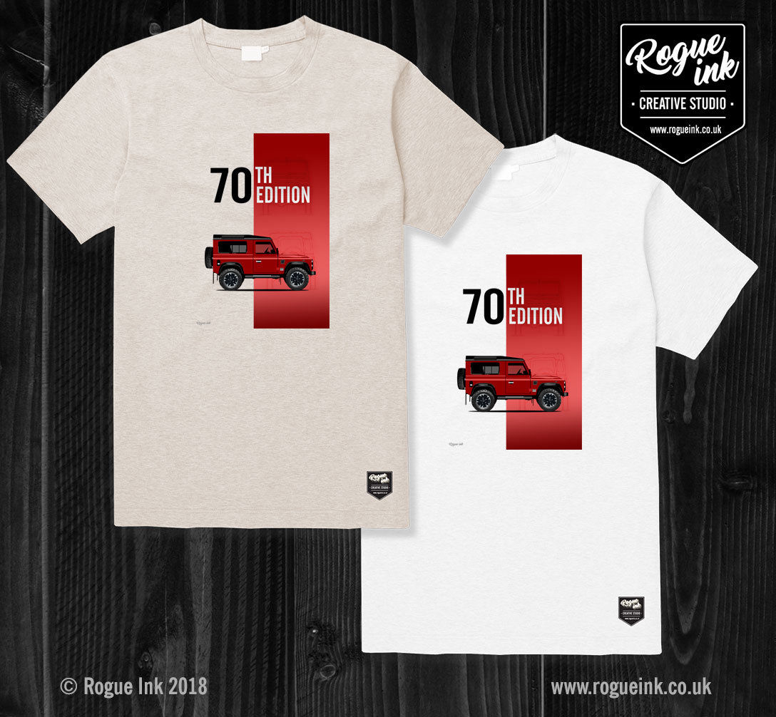 Land Rover Defender 90 70th Edition V8 T-Shirt illustration 100% Cotton T-Shirt illustration that has been designed by Rogue Ink and printed in the UK onto quality 100% cotton Gildan 185 GSM Heavy Cotton Deluxe T-Shirts.