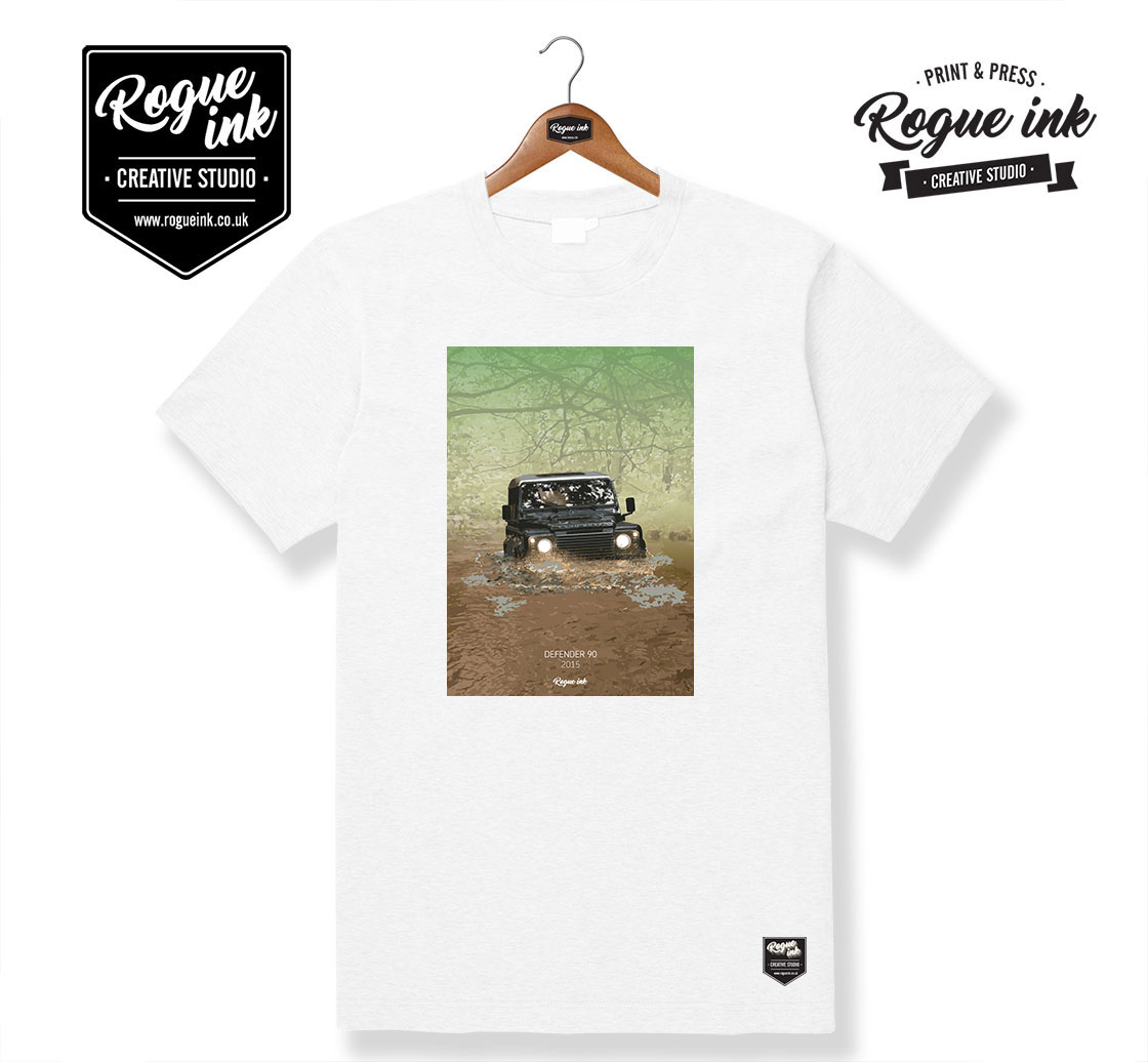 Land Rover Defender 90 Water Front Illustration that has been designed by Rogue Ink and printed in the UK onto quality 100% cotton Gildan 185 GSM Heavy Cotton Deluxe T-Shirts.