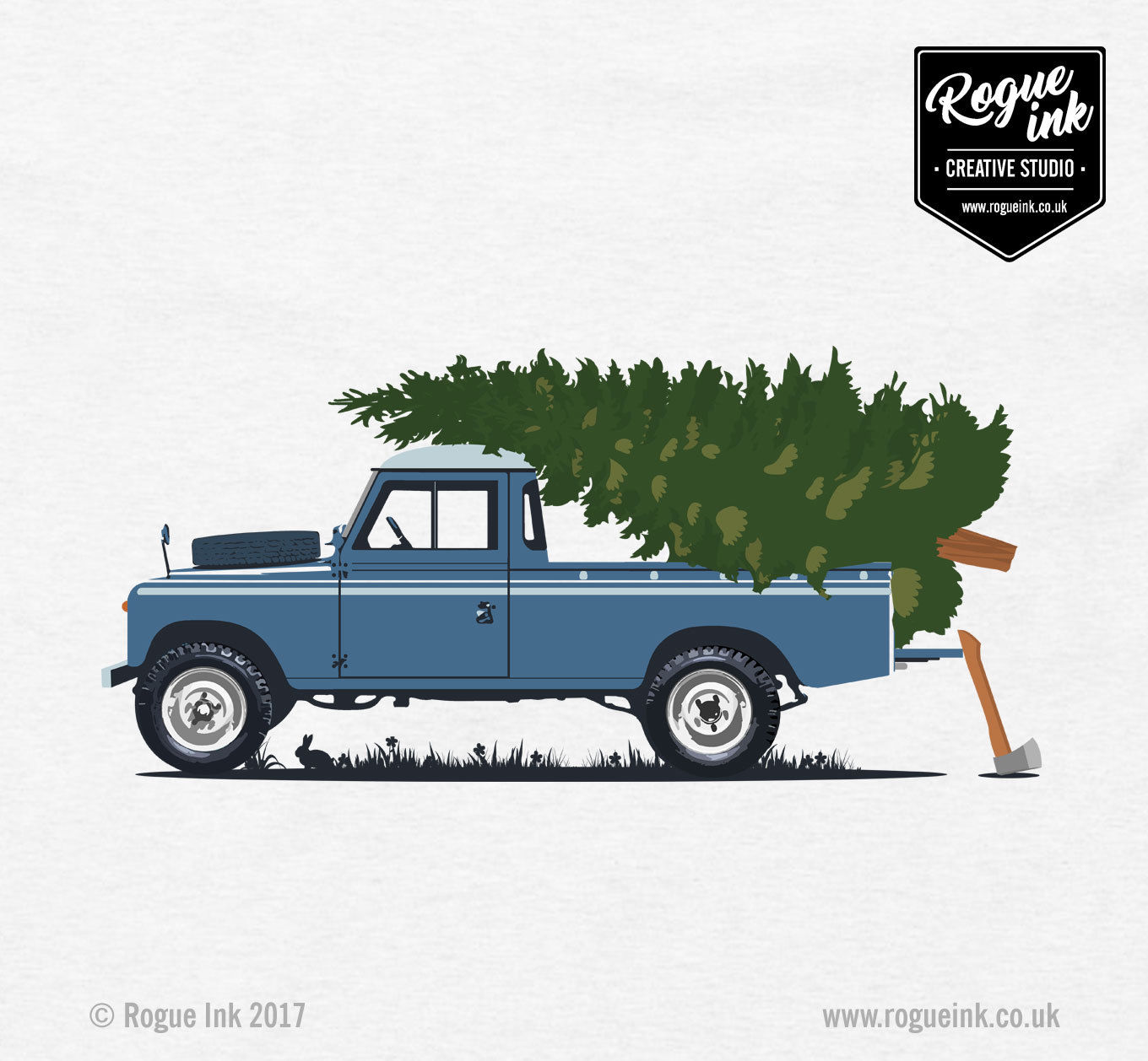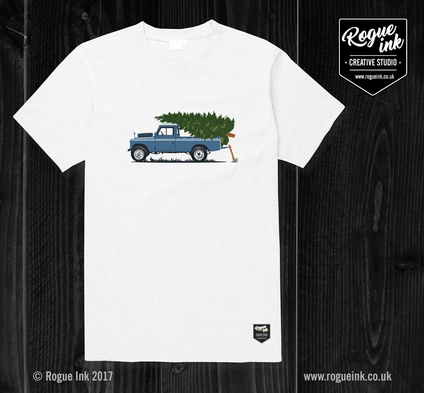 Land Rover Green or Blue Series 3 'LWB Pickup' Tree T-Shirt illustration that has been designed by Rogue Ink and printed in the UK onto quality 100% cotton Gildan 185 GSM Heavy Cotton Deluxe T-Shirts.